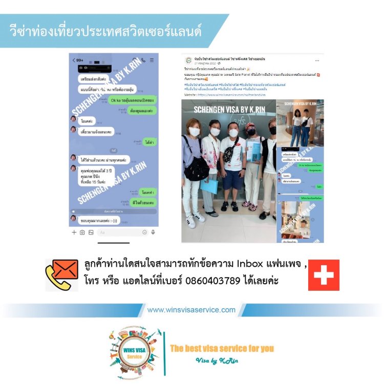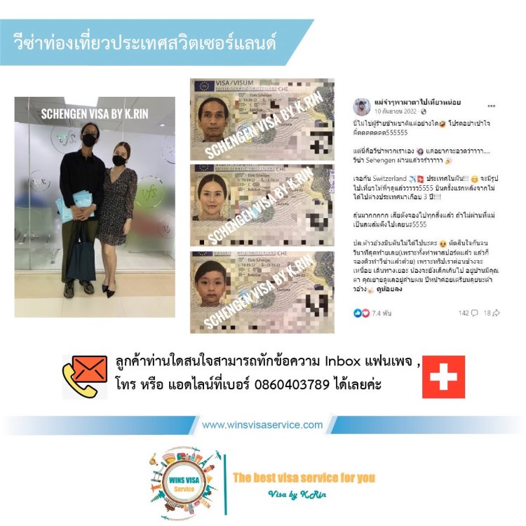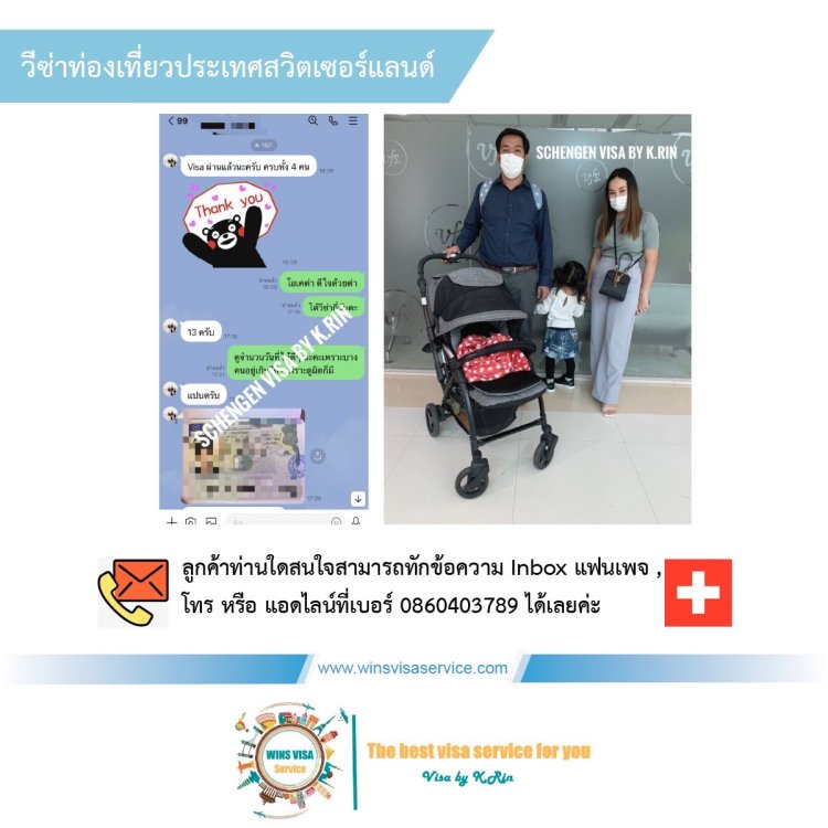 2.วีซ่าเยี่ยมเยียน (วีซ่าระยะสั้น) วีซ่าเยี่ยมเยียนประเทศสวิตเซอร์แลนด์ หรือ เรียกอีกอย่างหนึ่งว่า วีซ่าเช้งเก้น (Schengen) สำหรับผู้เดินทางที่มีจุดประสงค์ต้องการเดินทางไปเยี่ยมครอบครัว เยี่ยมญาติ เยี่ยมเพื่อน หรือเยี่ยมแฟน โดยที่ผู้เชิญพำนักอาศัยอยู่ที่ประเทศสวิตเซอร์แลนด์ สามารถขอวีซ่าได้สูงสุดจำนวน 90 วัน คลิ๊กดูรีวิว > ผลงานที่ผ่านมา